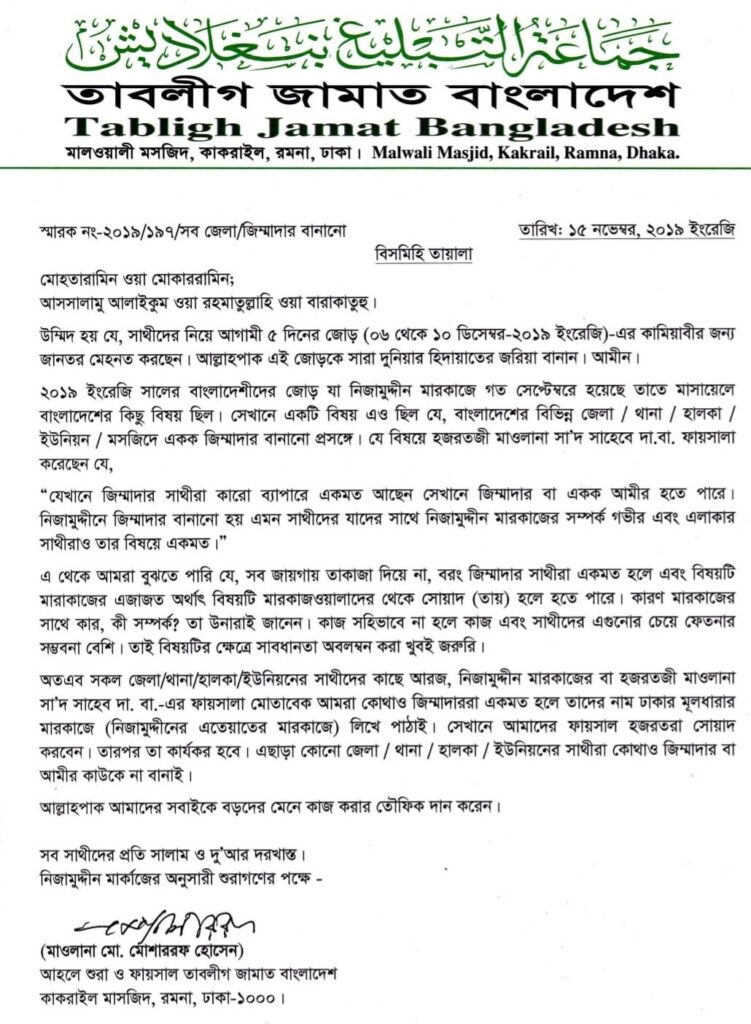 গত সেপ্টেম্বরে (২০১৯) দিল্লীর নিযামুদ্দিন বাংলেওয়ালী মসজিদে অনুষ্ঠিত বাংলাদেশের কথিত ‘এতাআতি’ সাথীদের জোড় থেকে তাদেরকে এই তাকাজা দেয়া হয় যে, তারা যেন সমস্ত জেলা/থানা/হালকা/ইউনিয়ন/মসজিদগুলোতে তাদের ‘একক জিম্মাদার’ বা ‘একক আমীর’ নির্ধারন করে নেয়। তবে, কথিত ‘এতাআতি’ সাথীদের শীর্ষ পর্যায় থেকে শুরু করে তৃণমূল পর্যায় পর্যন্ত তাদের জিম্মাদার/নেতৃস্থানীয় সাথীদের মাঝে অনাস্থাপূর্ণ হালতের কারণে তাদের দিল্লীর ঐ জোড় শেষে প্রায় ৩ মাস অতিবাহিত হয়ে যাওয়ার পরও তারা সেই তাকাজার ব্যাপারে কোন সুরাহায় পৌঁছতে পারেনি। এক পর্যায়ে শীর্ষ পর্যায় থেকে (কাকরাইল থেকে) প্রায় ৩ মাস পর গত ১৫ই নভেম্বর (২০১৯) ‘এতাআতি’ সাথীদের মাঝে লিখিতভাবে এলান করে দেয়া হয় যে, তারা যদি তাদের জিম্মাদার হিসেবে কারো ব্যাপারে একমত হয়ে যান, তাহলে তাদের নাম যেন ঢাকার শীর্ষস্থানীয় মুরুব্বীদের নিকট লিখে পাঠায়। এরপর সেখান থেকেই চুড়ান্তভাবে জিম্মাদার নির্ধারন করে দেয়া হবে।